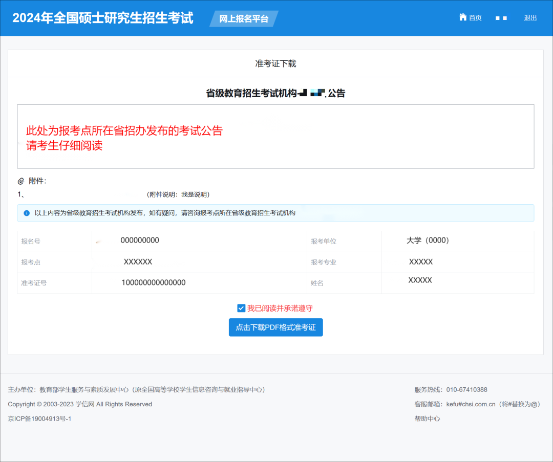 各位考生請注意,這個(gè)頁面上的提示一定要認(rèn)真閱讀,然后勾選“我已閱讀并承諾遵守”后,再點(diǎn)擊“下載PDF格式準(zhǔn)考證”的按鈕。