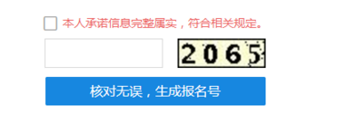 (4)、報(bào)名表生成后,請(qǐng)仔細(xì)查看信息是否正確,然后在頁(yè)面底部輸入“驗(yàn)證碼”,點(diǎn)擊藍(lán)色長(zhǎng)條按鈕生成報(bào)名編號(hào)。
