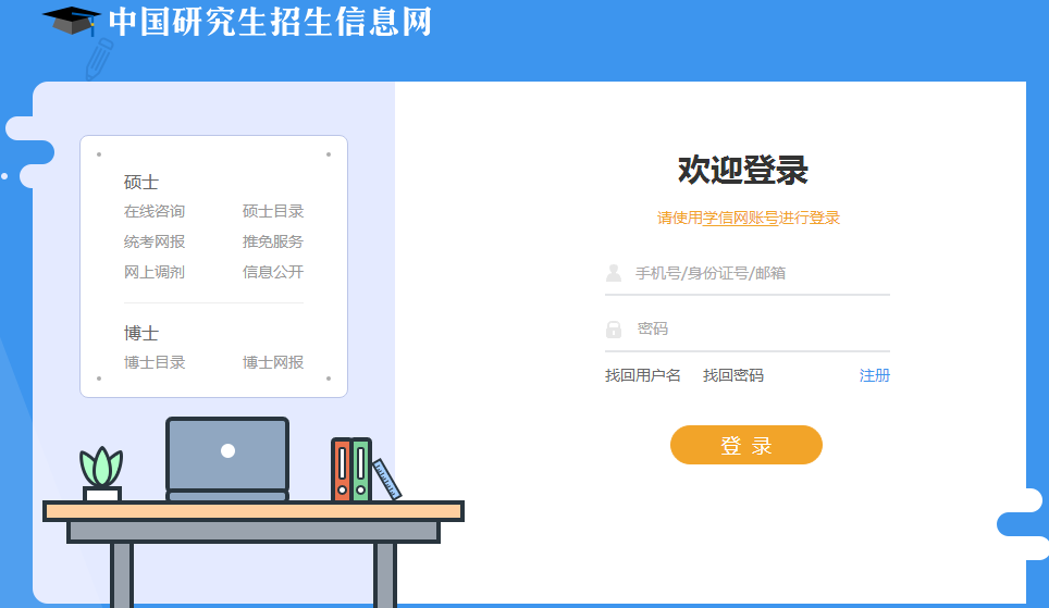 若未注冊(cè)請(qǐng)先在頁(yè)面右邊點(diǎn)擊注冊(cè)學(xué)信網(wǎng)賬號(hào),若已注冊(cè)直接輸入賬號(hào)和密碼登錄即可。