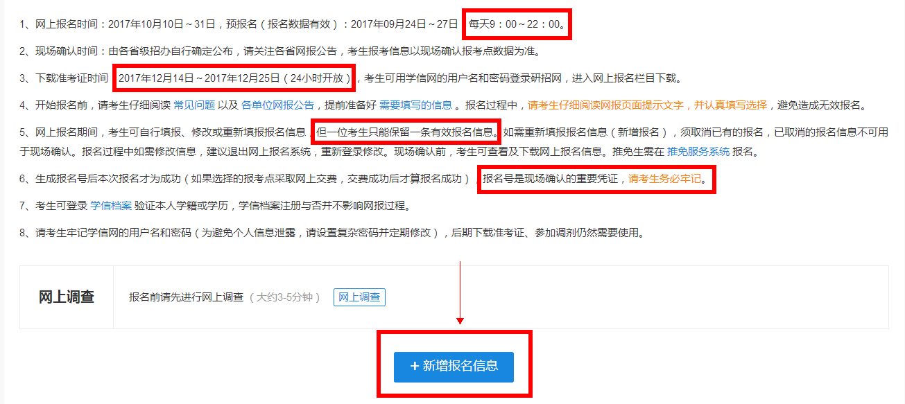 ● 2017年全國(guó)統(tǒng)考網(wǎng)上報(bào)名時(shí)間:2017年10月10日~31日每天9:00—22:00(逾期不再補(bǔ)報(bào),也不得再修改報(bào)名信息)。網(wǎng)址:http://yz.chsi.com.cn中國(guó)研究生招生信息網(wǎng)。