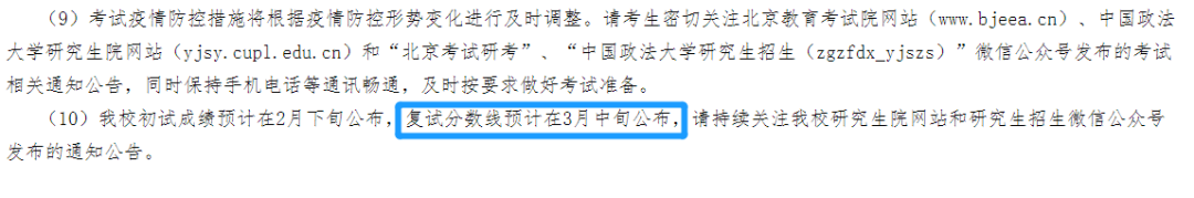 中國(guó)政法大學(xué)在官網(wǎng)公布:復(fù)試分?jǐn)?shù)線預(yù)計(jì)在3月中旬公布。