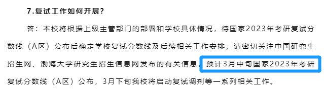 渤海大學(xué)官網(wǎng)公布:預(yù)計(jì)3月中旬國(guó)家2023年考研復(fù)試分?jǐn)?shù)線(A區(qū))公布,3月下旬我校將啟動(dòng)復(fù)試調(diào)劑等一系列相關(guān)工作。報(bào)考渤海大學(xué)的同學(xué)們要注意啦,從官方通知來看,國(guó)家線公布一周后,渤海大學(xué)就要開啟復(fù)試和調(diào)劑工作,時(shí)間點(diǎn)一定要注意哦!
