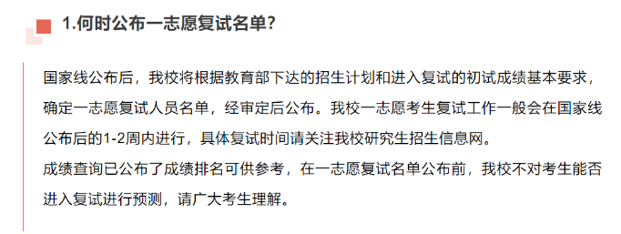 新疆師范大學(xué)研究生會(huì)官方公眾號(hào)于3月2日發(fā)出《新疆師范大學(xué)2023年碩士研究生招生熱點(diǎn)問題解答》,提到國(guó)家線將于三月中旬公布,復(fù)試分?jǐn)?shù)線將在國(guó)家線公布后及時(shí)發(fā)布,一志愿考生復(fù)試工作一般在復(fù)試名單公布后的1-2周左右進(jìn)行。