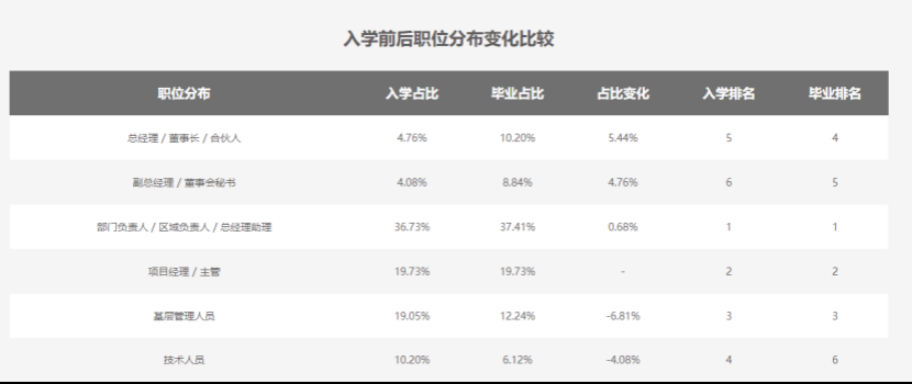 據(jù)根據(jù)部分招生單位公布的就業(yè)數(shù)據(jù)來看,畢業(yè)生可以到咨詢、金融、科技等MBA主流行業(yè)就業(yè),除此以外,IT\電信業(yè)、教育\文化\傳媒廣告業(yè)、房地產(chǎn)業(yè)等行業(yè)也是MBA的熱門選擇。不少畢業(yè)生成功轉(zhuǎn)行、晉升管理層,可見,越來越多不同行業(yè)領(lǐng)域都需要MBA人才,畢業(yè)后的就業(yè)選擇多,MBA也更能適應(yīng)市場(chǎng)的需求。例如,從浙江大學(xué)MBA入學(xué)前后職位分布變化的比較中可以看出,MBA畢業(yè)后從事高層管理職位的占比增大,學(xué)業(yè)的完成也為未來的職業(yè)道路錦上添花。