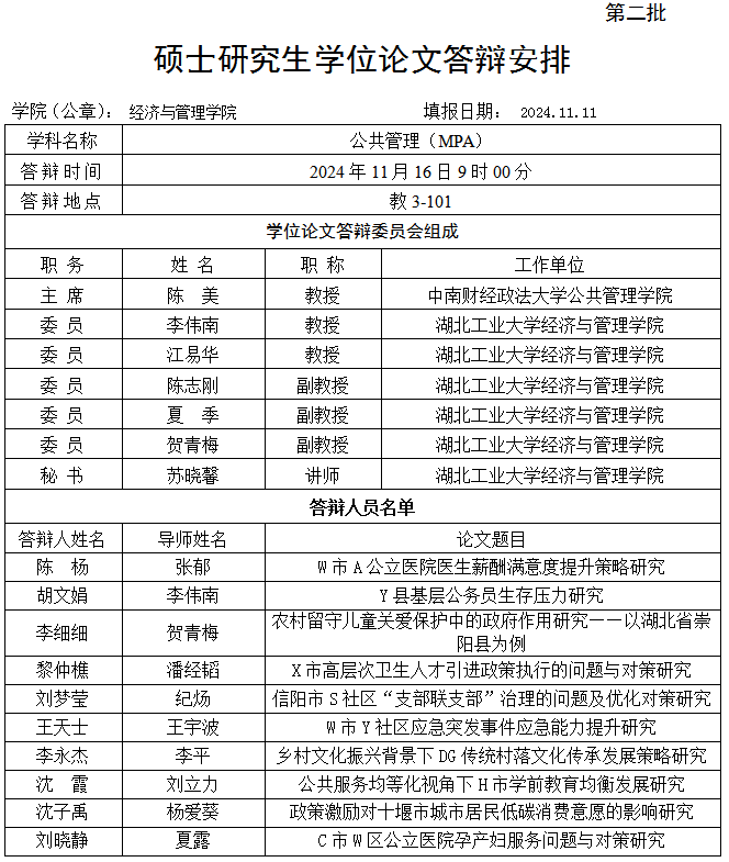 【湖工大MPA】碩士研究生學(xué)位論文答辯安排(公共管理MPA)